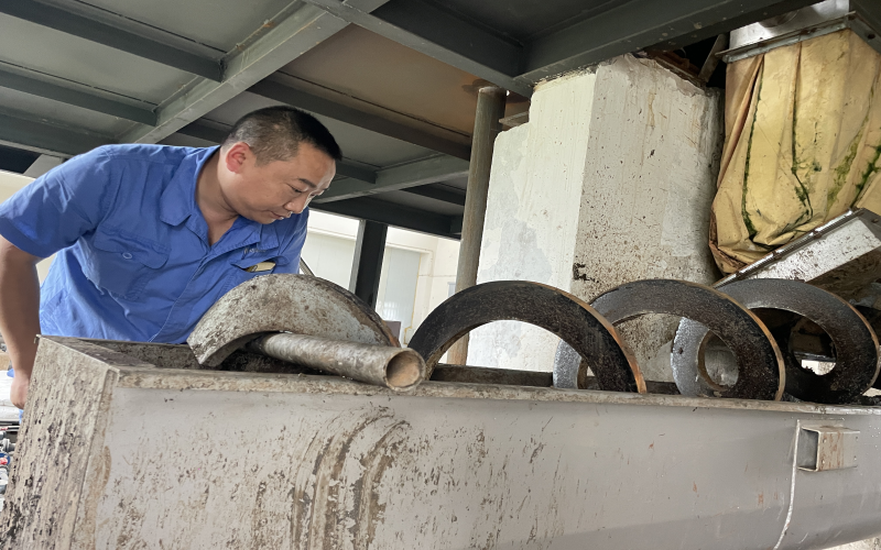 2018年1月,王穎被安排到新建成的周家壩污水廠工作,由于有污泥脫水的工作經(jīng)驗(yàn),帶頭學(xué)習(xí)新廠新設(shè)計(jì)的板框壓濾系統(tǒng)的重?fù)?dān)自然而然落在他肩上,他沒(méi)有抱怨新廠離家遠(yuǎn)、交通不便利、脫水車(chē)間環(huán)境差等客觀問(wèn)題,而是靜下心來(lái)一頭扎進(jìn)學(xué)習(xí)的熱潮中。板框脫水系統(tǒng)看似只有進(jìn)泥、調(diào)泥、壓泥、出泥幾道工序,但整套流程下來(lái)需要進(jìn)行數(shù)十次步驟,還要根據(jù)泥質(zhì)調(diào)整步驟中的參數(shù),不厭其煩地記錄下每一次的試驗(yàn)數(shù)據(jù),午餐時(shí)間他都毅然堅(jiān)守在現(xiàn)場(chǎng),同事們幫忙打來(lái)的飯,基本上是扒拉幾口便又和師傅討論起問(wèn)題。尤其是炎熱的夏天“汗如泉涌”,機(jī)房的氣味刺鼻難聞,很多人不愿久干,為了能保證新廠正常出水投運(yùn),做好污泥處理的大后方,他堅(jiān)持下來(lái)了,正是這樣重復(fù)的“常規(guī)操作”讓他順利出師。